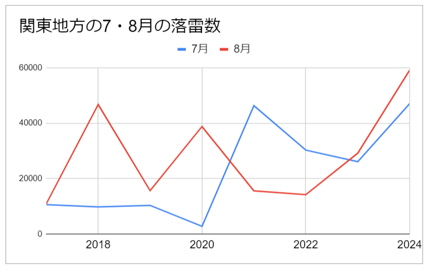 雷については過去5年において7月と8月で発生率は均衡しています。