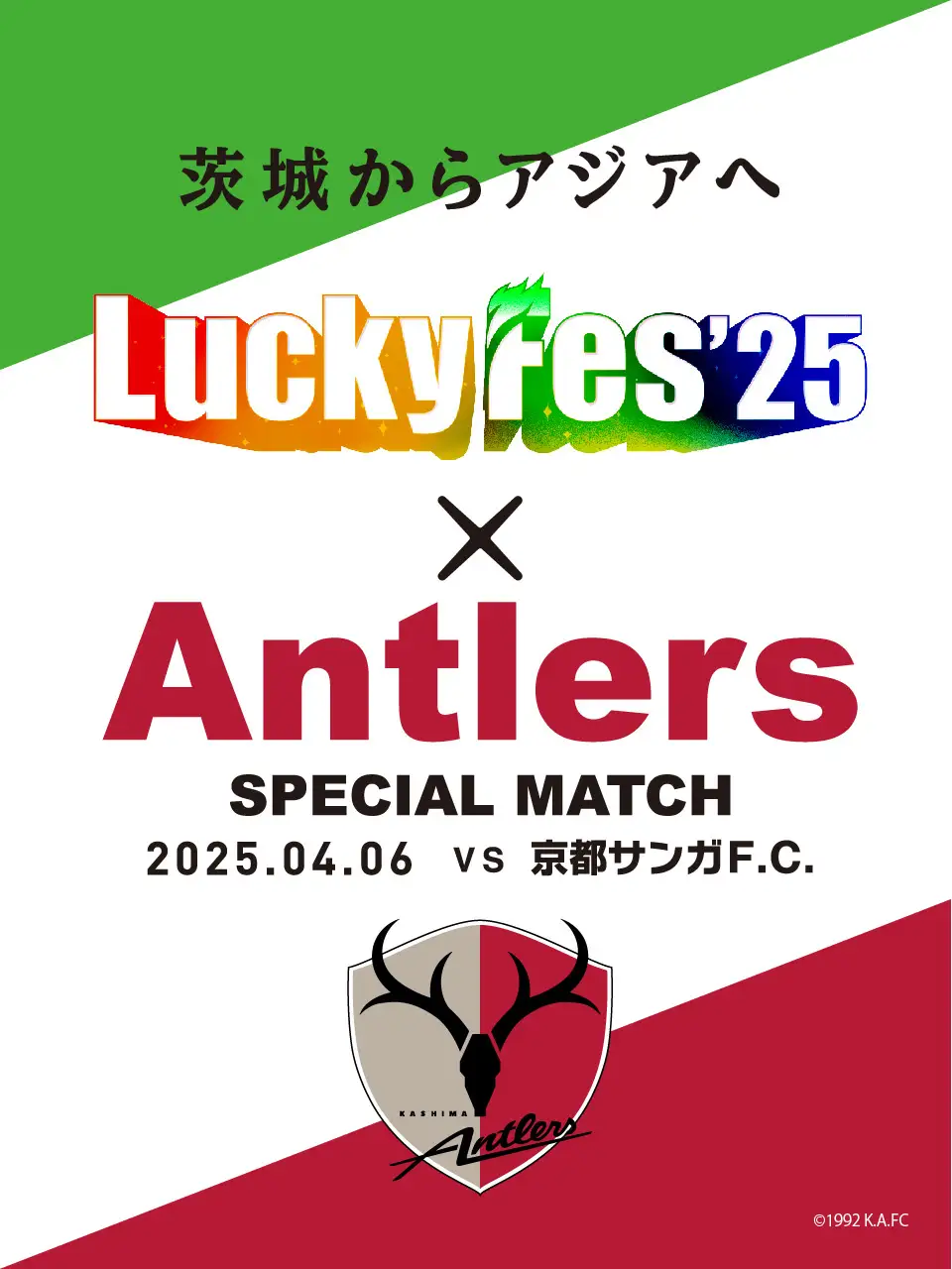 株式会社LuckyFM茨城放送(本社所在地:茨城県水戸市)は、鹿島アントラーズとコラボし、4月6日(日)に行われる「2025明治安田J1リーグ第9節 京都サンガF.C.戦」において、「LuckyFes × ANTLERS SPECIAL MATCH ~茨城からアジアへ~」を開催することをお知らせいたします。また、本試合を共に盛り上げるべく、公開生放送「LuckyFes × Antlers SPECIAL MATCH LuckyFM 公開生放送」や抽選会、現地でのLuckeyFes’25チケット販売を実施いたします。