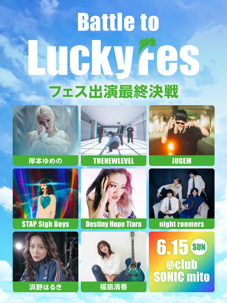 最終選考に進出するのは1,328組もの応募の中から、音源審査と動画審査を通過した8組です。最終選考会は6月15日(日)に水戸のclub SONIC mitoにて有観客で実施します。審査員5名と観客の評価の高かった最大3名が、8月9日(土)・10日(日)・11日(月・祝)の3連休に国営ひたち海浜公園で開催するLuckyFes’25のステージに出演します。また、副賞として10万円も進呈します。