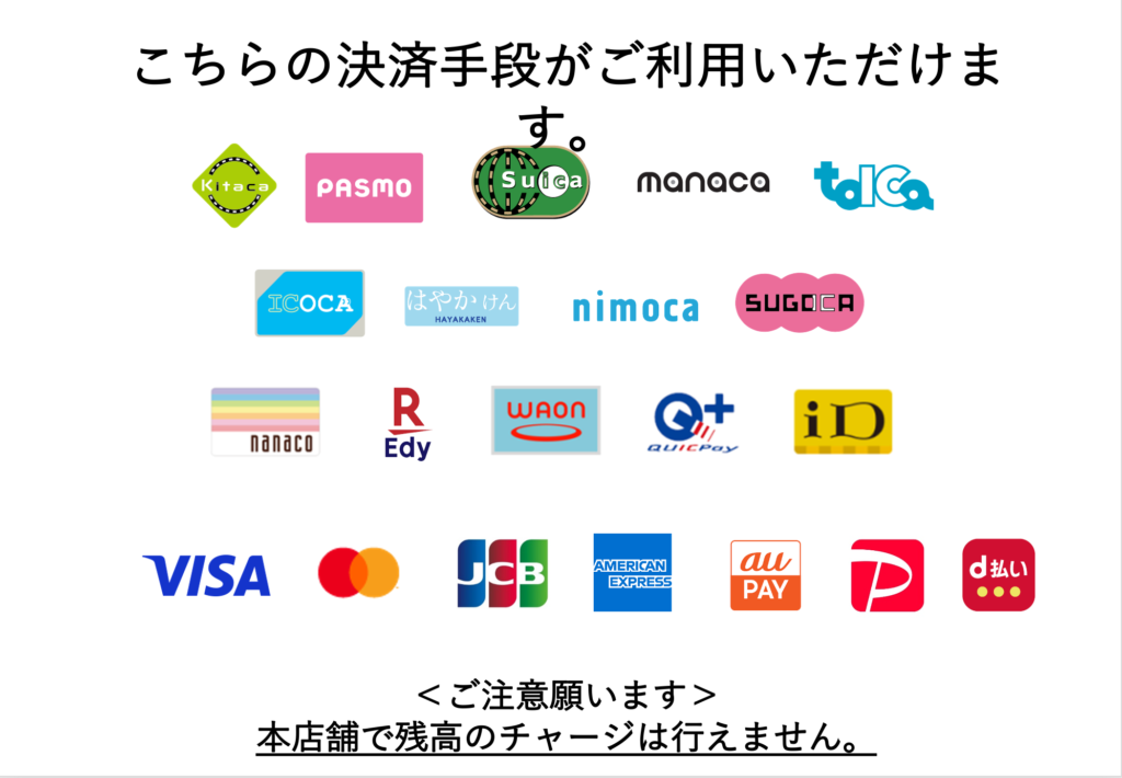 iD / QUICPay / nanaco / 楽天Edy / WAON / Kitaca / PASMO / Suica / manaca / TOICA / ICOCA / はやかけん / nimoca / SUGOCA