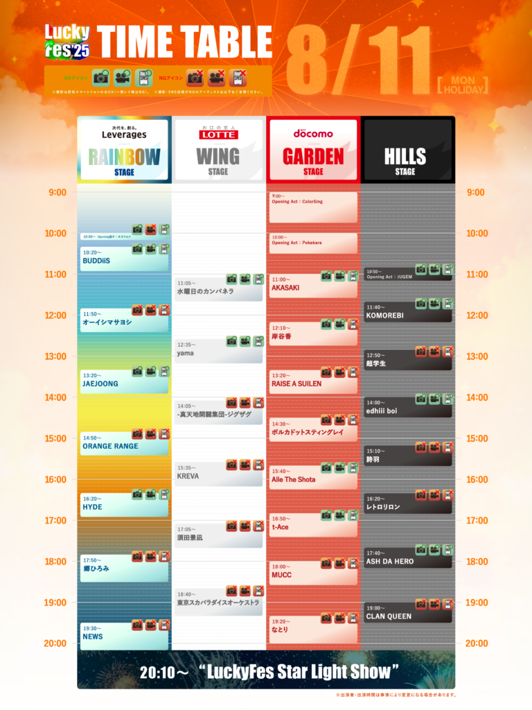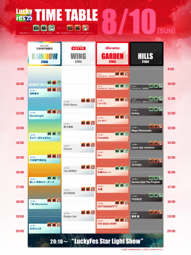 LuckyFesでは、昨年に引き続き撮影及びSNS投稿は原則OKとします。ただし、撮影及びSNS投稿がNGなアーティストの方々もいますので、各アーティストの意思を尊重してルールを遵守していただきますようお願いします。撮影などの可否についてはタイムテーブルに記載していますので、注意事項と合わせてご確認ください。