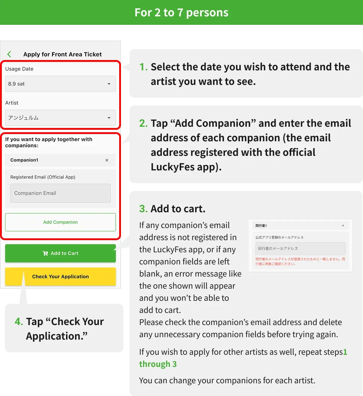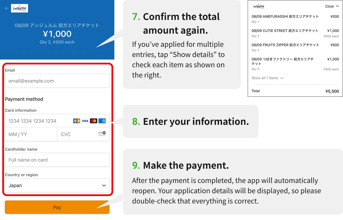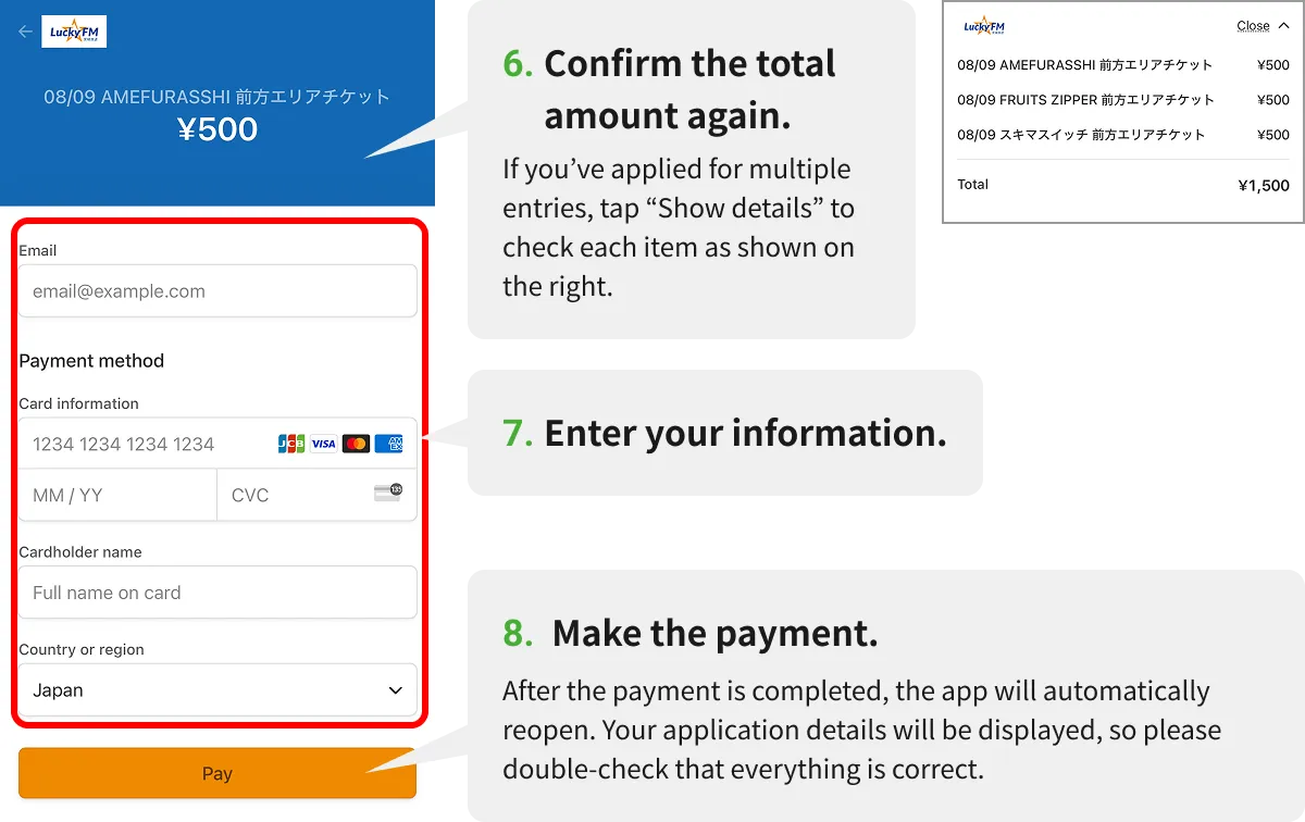 Entry to the front area is conducted in order of assigned numbers. Please have your Front Area Priority Access Ticket screen ready on the LuckyFes official app.